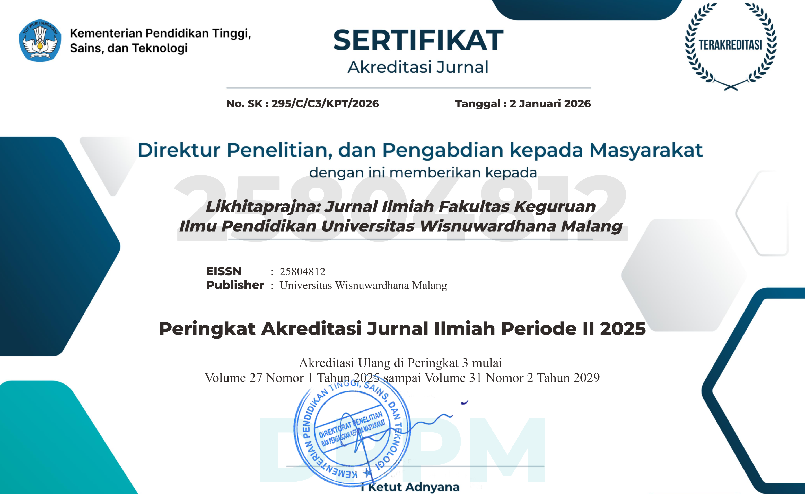 Penulis yang menerbitkan karya ilmiahnya di Likhitaprajna setuju dengan ketentuan berikut: manuskrip yang diajukan dan dipublikasikan tetap menjadi hak publikasi penulis dengan karya yang dilisensikan secara bersamaan di bawah Lisensi Internasional Creative Commons Attribution-ShareAlike 4.0.